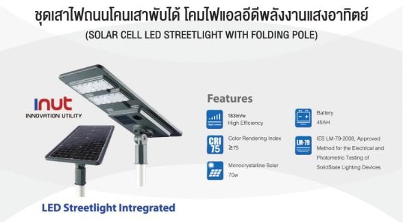 ชื่อสามัญของผลงานนวัตกรรมไทย : ชุดเสาไฟถนนโคนเสาพับได้โคมไฟแอลอีดีพลังงานแสงอาทิตย์