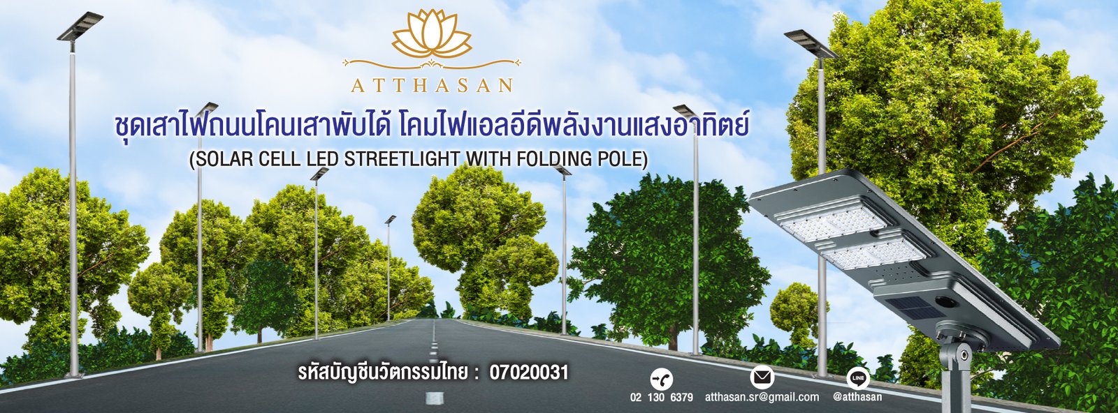 บริษัท อัตถสาร จำกัด ประกอบกิจการโรงงานผลิตและจำหน่าย โคมไฟพลังงานแสงอาทิตย์ อุปกรณ์ไฟฟ้าทุกชนิดประกอบกิจการรับจ้างออกแบบ ติดตั้งระบบโซล่าเซลล์ และรับเหมาติดตั้งระบบไฟฟ้าส่องสว่าง สินค้านวัตกรรมเลขที่ 07020031 ชุดเสาไฟถนนโคนเสาพับได้ โคมไฟแอลอีดีพลังงานแสงอาทิตย์